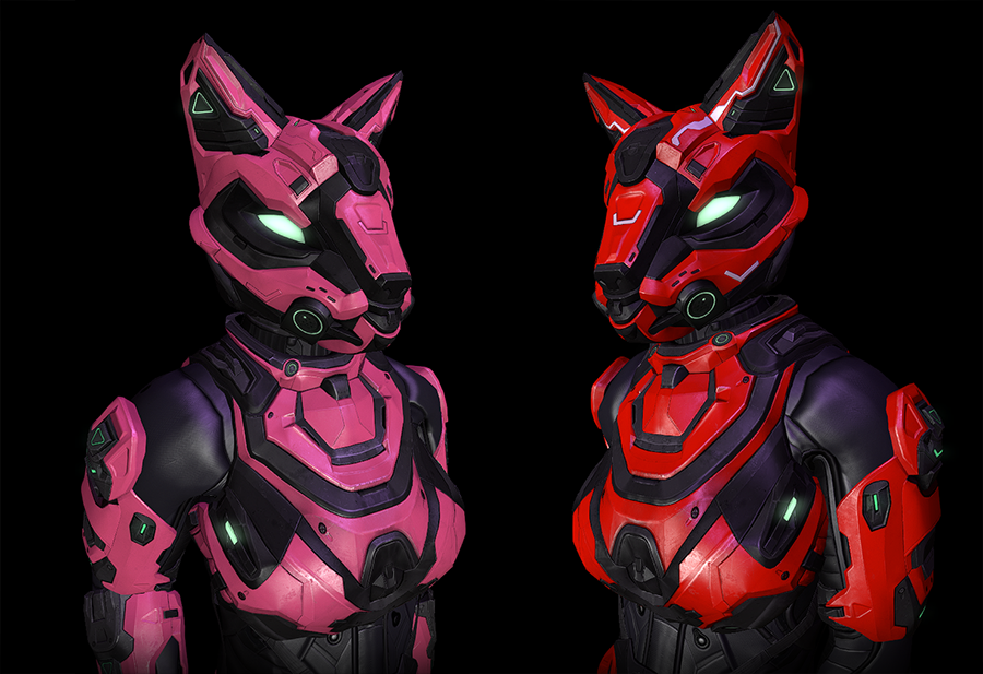 My VALKUS Acronoid Head is a feline alternative to the WHIRLWIND model, featuring both a custom head and torso + upper arm and leg armor parts. A new tail is also included! The WHIRLWIND avatar is required for the body. The Substance Painter file is also included!