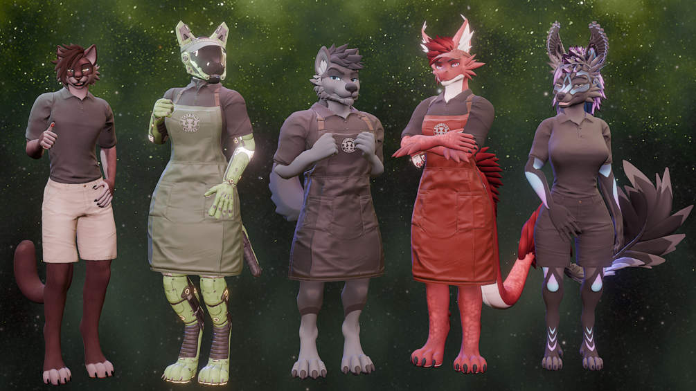 Our Starbolds Barista Outfit is perfect for restaurant work of all varieties, and can even be worn casually without the apron and visor, providing a charming polo shirt + khaki pants combo! Logo-less variants are also included, as well as black variants for the apron and shorts~